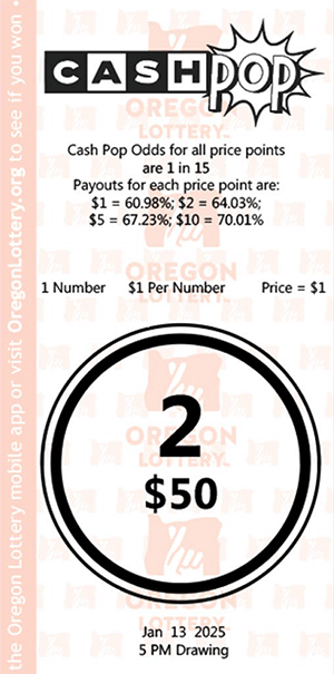 Each drawing will be for a single winning number from 1 – 15. If your number is chosen, you win the prize indicated for that number on your ticket. The prize for your number will be assigned randomly at the time of purchase and will vary. At minimum, a win will be five times your chosen purchase price. The maximum Cash Pop prize is $2,500 (at the $10 purchase price).